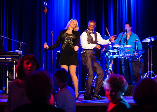 Die Zahl der Besucher hätte doppelt so groß sein können. Bereits seit Oktober war die Party im Steinhof ausverkauft. Die Organisatoren hatten sich aber fest vorgenommen, den Gästen eine große Tanzfläche zu bieten. Die Rechnung ging auf. Der Saal war geschmackvoll dekoriert und so spielten wir zum Empfang zunächst etwas Dinnermusik im Trio. Anschließend wurde um 21.30 h durch Sängerin und Sänger erweitert und im Quintett ging es weiter. Im Steinhof wurde gefeiert und vor allem sehr viel getanzt. Schnell wurde klar, die Entscheidung für eine große Tanzfläche war absolut richtig. Es sollte eine sehr lange Nacht für uns alle werden, denn unser Auftritt ging nach 8 Stunden weiter in die Verlängerung.